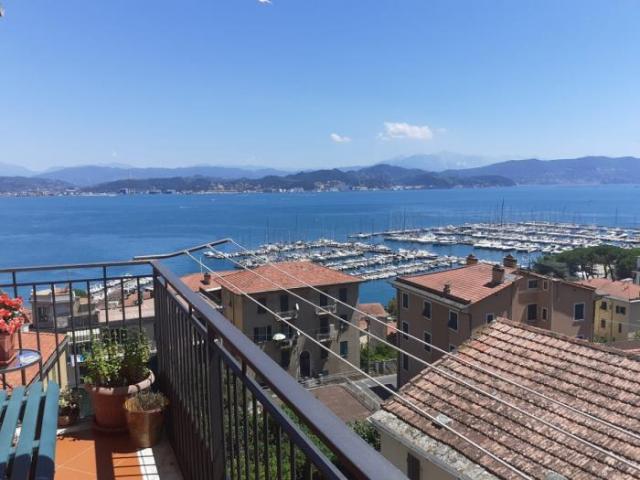 Nel borgo di Fezzano all'ultimo piano di tre in stabile ristrutturato, ampio appartamento in ottimo stato, composto da grande cucina, salone doppio con due finestre e balcone tutti con favolosa vista mare, grande camera da letto matrimoniale (20 mq circa) con bagno privato, due camere da letto di cui una con stanza armadi finestrata, grande bagno con finestra.